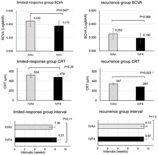 The refractory patients included in this study were categorized into two groups: the limited-response group, comprising individuals with a restricted response to IVA (14 eyes), and the recurrence group, consisting of individuals whose DME improved but recurred in a short timeframe (15 eyes). A comparative analysis of BCVA, CRT, and intervals was conducted for both groups after IVAn and after IVF4 using a mixed model. Error bars represent standard error of the mean (SEM). *: This value means p < 0.05 in mixed-effects model.