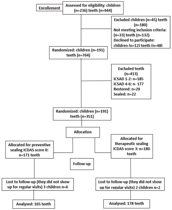 Out of the 236 examined children, 45 were excluded either because they did not fall into the high-caries risk group according to the CAMBRA classification or because their four permanent first molars had already been sealed or restored, were affected by hypoplasia, fluorosis, or other developmental anomalies, or displayed carious lesions that, according to the ICDAS II classification, scored at least 4. Therefore, the authors included 191 children and 764 permanent first molars in the study. These were categorized according to the ICDAS classification as follows: ICDAS score 0–171 (22.38%) molars, ICDAS score 1–2–185 (24.21%) molars, ICDAS score 3–180 (23.56%) molars, ICDAS score 4–6–177 (23.16%) molars. Twenty-nine molars (3.79%) had fillings, and 22 (2.87%) were sealed. So, the initial sample included 171 caries-free molars, forming the Control group, and 180 molars categorized according to the ICDAS classification with a score of 3, forming the Study group.