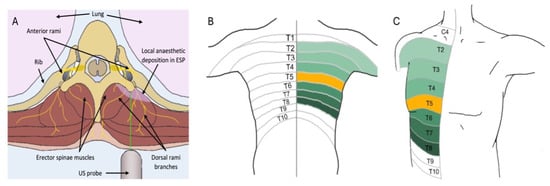 - Dautzenberg, K.H.; Zegers, M.J.; Bleeker, C.P.; Tan, E.C.; Vissers, K.C.; van Geffen, G.-J.; van der Wal, S.E. Unpredictable injectate spread of the erector spinae plane block in human cadavers. Anesth. Analg. 2019, 129, e163–e166. [Google Scholar] [CrossRef]