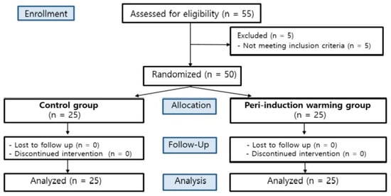A total of 55 patients who underwent TURB or TURP under general anesthesia were eligible for participation in this study. Five patients were excluded because they did not meet the inclusion criteria. One patient had severe aortic stenosis, and four patients had chronic kidney disease. The remaining 50 patients were randomly assigned to either the control group (n = 25) or the peri-induction warming group (n = 25). There were no patients who were lost to follow-up or discontinued in both groups. All 50 patients were analyzed (Figure 1).