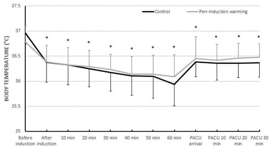 Patients’ core tympanic temperatures were measured using a Thermoscan IRT tympanic thermometer (Braun, Kronberg, Germany) while the patients were awake. Three measurements were made, and the highest one was recorded. During the operation, patients’ esophageal temperature was measured using an esophageal stethoscope (Erae SI Co., Ltd., Seoul, Republic of Korea), which was inserted 28–32 cm from the upper incisors. Core temperature was measured upon entrance to the operating room (T0), immediately after induction of anesthesia (T1), in 10 min intervals until the end of the operation (Tend), and in 10 min intervals after arriving in the PACU. The core temperatures of all patients were measured by an anesthesia nurse who did not know which group the patient was assigned to. Intraoperative hypothermia was defined based on the temperature recorded at the end of the operation. Mild hypothermia was defined as 35.0–35.9 °C, moderate hypothermia as 34.0–34.9 °C, and severe hypothermia as <34.0 °C [].