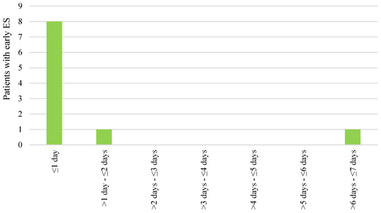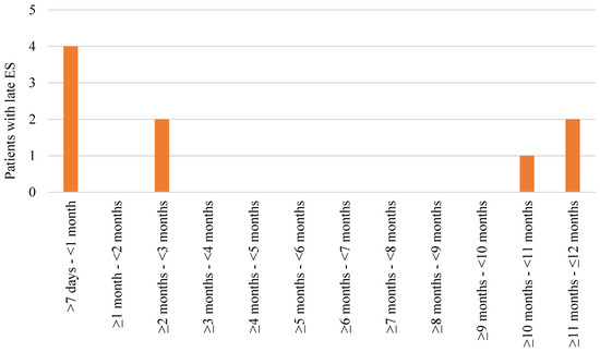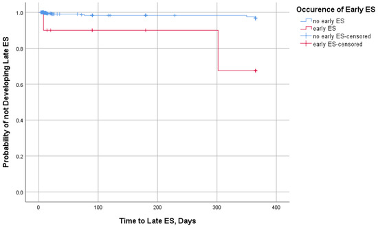 Data were analyzed using the SPSS 27 software program. Sample-size normality was assessed using the Shapiro–Wilk test. Since no continuous variables followed a normal distribution, the means were compared using the Mann–Whitney U test. For categorical variables, Fisher’s exact test was used. To evaluate the probability of not developing late ES over time for patients with early ES, the Kaplan–Meier analysis was used. Statistical significance was assumed when p < 0.05.