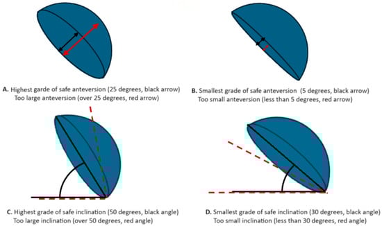 The proper positioning of the acetabular component of the endoprosthesis is important in minimizing the risk of complications due to the operation, such as hip instability, improper polyethylene wear or iliopsoas impingement [9]. There are many factors that may influence the operation, such as pre-existing deformities, poor bone quality, the surgical technique and implant selection. Since patients’ factors are difficult to change, there is always a need for significant improvements in other fields, such as the design of implants, better surgical techniques, etc. Clinicians also devote effort to the proper preoperative planning to avoid complications, although there is always a possibility of underestimating some factor that is crucial. A few of these factors have already been identified as important and proven to affect the cup placement, such as obesity [10], the handedness of the surgeon [11] and the axial rotation of the patient on the operating table [12]. Thus far, the impact of the offset on the abductor lever arm, instability and function has been well described [4,10]. Proper soft tissue tensioning achieved by offset restoration has a positive influence on abductor muscle function and hip stability; excessive soft tissue tension may lead to faster polyethylene wear; and decreased soft tissue tension may lead to instability and improper muscle function, which sometimes results in the Trendelenburg sign. Besides the offset, the angular position is another vital parameter; in particular, anteversion is believed to have an important role in the stability and function of the hip [4,10] and is believed to be still underinvestigated. Suboptimal angular positioning may pose a huge problem for patients in their daily living activities and lead to lower satisfaction following treatment, and it may sometimes pose a major challenge for surgeons [13].