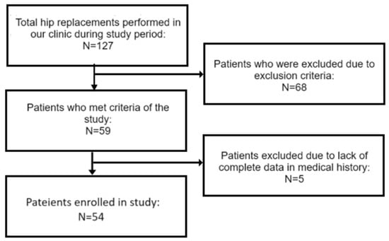 The initial sample size for the study was estimated according to method described by Sim and Lewis [20] and established by general principle to be equal to around 55 patients. Unfortunately, due to differences in regard to the positioning of the implant, being one of the radiological outcome measures for the evaluation of a surgical treatment’s technical effectiveness, it was only possible to gather 10 patients with implants positioned outside Lewinnek’s safe zone within the set period of inquiry. Thus, it was decided to include a sufficient number of patients with implants positioned within Lewinnek’s safe zone and operated on within the same time period as the aforementioned group, to achieve the established sample size and, in this way, to evaluate the possible ratio of patients with implants outside and within the safe zone for future studies. Unfortunately, due to the number of patients excluded from the study in line with the exclusion criteria, N = 54 was the final number of patients included. Hedge’s g was used to estimate the effect size and achieve the power of the tests. The flowchart of the population is in Figure 2.