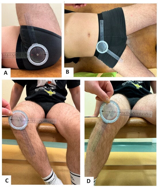 Part of the examination performed preoperatively. The measurement of flexion (A), abduction (B), external rotation (C) and internal rotation (D) presented on a model.
