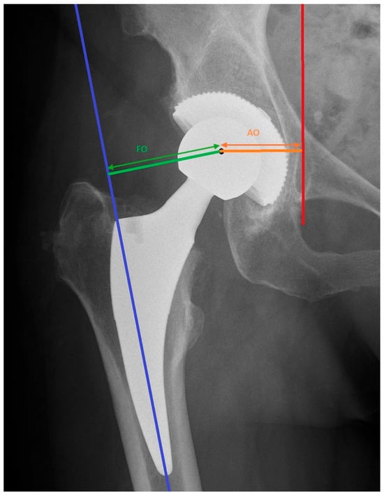 Anatomical axis of the femur (blue line), vertical trans-teardrop line (red line), center of rotation (black point), femoral offset (FO, green arrow), acetabular offset (AO, orange arrow).