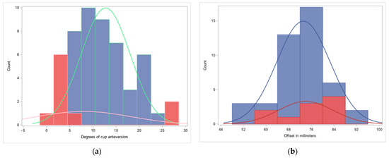 The statistical analysis showed the distribution of the key parameters that were examined in the patients. The distributions of the cup anteversion, measured in degrees, and the offset, which was measured in millimeters, are presented in Figure 7.