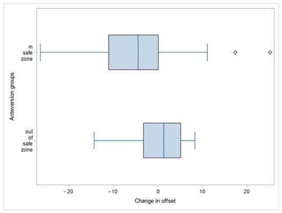 There were no significant differences between the group with anteversion within Lewinnek’s safe zone and the group with anteversion outside Lewinnek’s safe zone in regard to the total offset (78.5 ± 12.4 vs. 74.0 ± 9.7, p = 0.8) and change in total offset (−5.3 ± 10.7 vs. 0.56 ± 6.8, p = 0.1), as shown in Figure 8.