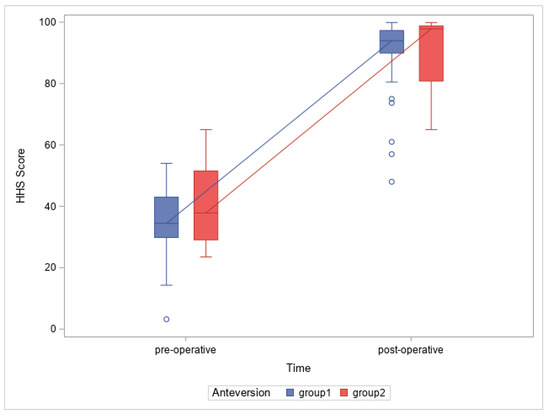Anteversion and HHS score change (for comparison between preoperative values, g = 0.53, power = 0.31; postoperative values, g = 0.04, power = 0.05; and change in values, g = 0.315, power = 0.14 of HHS, respectively).