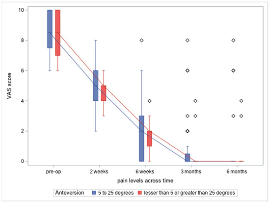 Anteversion and associated pain (VAS scale) at different time points (from the left: before operation, 2 weeks after operation, 6 weeks after operation, 3 months after operation, 6 months after operation).