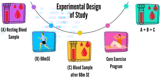 After the participants were randomly divided into the CEG and CG groups, both groups continued with soccer training, while CEG included extra core exercise training. Meanwhile, CG performed a warm-up with a ball. On the day of blood collection, the athletes received 8 h of sleep and were warned not to take stimulants on an empty stomach (A). After the first blood collection, a 60-min submaximal exercise (60 mSE) (10 min warm-up, 5 min stretching, 15 × 2 min 70–75% maximum HR (HRmax), 10 min jogging, 5 min stretching) was performed (B). The Karvonen formula was used to calculate the HR reserves of the participants before each test session []. The second blood sampling was performed immediately after the exercise (C). The same procedure was repeated at the end of the eighth week (A-B-C) (Figure 1).
