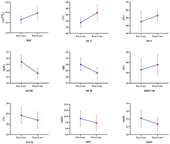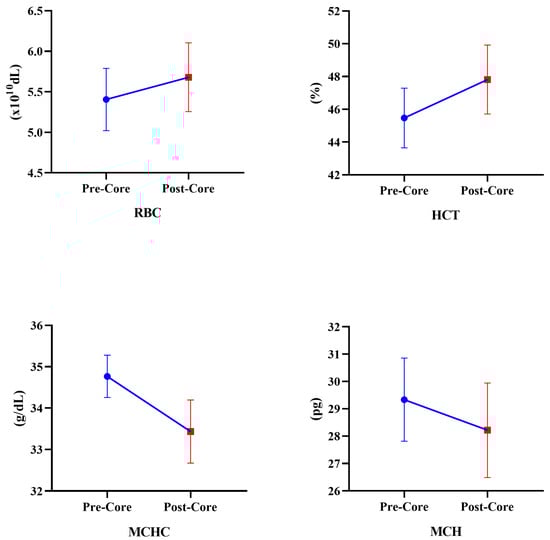 Table 3 presents the chronic effects of the eight-week core exercise program on hematological parameters. According to these results, in the CEG, an increase in RBC (Z = −2.201, p = 0.028) and HCT (Z = −2.021, p = 0.028) values was observed. However, MCHC (Z = −2.027, p = 0.027) and MCH (Z = −2.226, p = 0.026) values decreased (Figure 2). In the CG, RBC (−2.203, p = 0.043), HCT (Z = −2.032, p = 0.042), MCV (Z = −2.023, p = 0.043), and RDW-SD (Z = −2.023, p = 0.043) values increased. On the other hand, MCHC (Z = −2.023, p = 0.043), MCH (Z = −2.023, p = 0.043), PLCR (Z = −2.023, p = 0.043), MPV (Z = −2.032, p = 0.042), and PDW (Z = −2.023, p = 0.043) values significantly decreased (Figure 3). According to the repeated measure Anova test results between CEG and CG, in the time interaction, the participants’ hematological parameters RBC [F(1,9) = 33.714, ηp2 = 0.78, p < 0.001], HCT [F(1,9) = 36.569, ηp2 = 0.80, p < 0.001], MCHC [F(1,9) = 166.594, ηp2 = 0.94, p < 0.001], MCH [F(1,9) = 68.571, ηp2 = 0.88, p < 0.001], PLCR [F(1,9) = 7.628, ηp2 = 0.45, p = 0.22], MPV [F(1,9) = 5.829, ηp2 = 0.39, p = 0.039], and PWD [F(1,9) = 9.983, ηp2 = 0.52, p = 0.012] parameters were significantly different. There was no significant difference in the group*time interaction (p > 0.05). When the hematological parameters were examined, the level of significance was greater in favor of CEG.