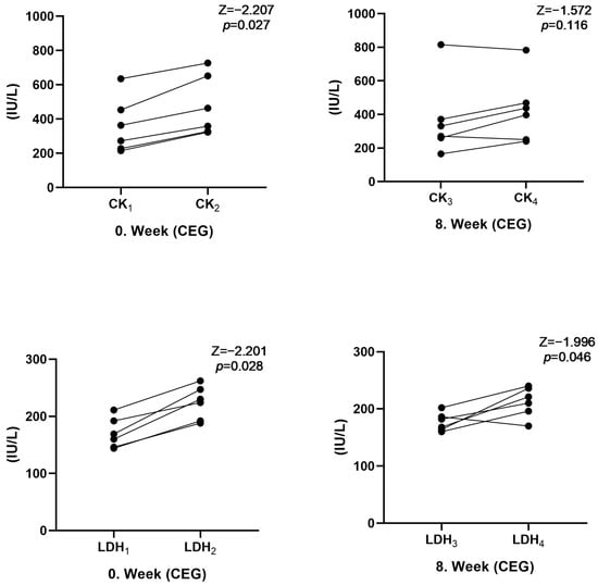 Figure 4 shows the acute changes in the biochemical parameters of the participants. Accordingly, CK (Z = −2.207, p = 0.027) and LDH (Z = −2.201, p = 0.028) values increased significantly after 60 min of submaximal exercise at week 0 in the CEG. No changes were observed in these parameters at week 8. There was no change in other hematological or biochemical parameters in the CEG (p > 0.05). In the CG, no acute changes were observed in any of the hematological or biochemical parameters after 60 min of submaximal exercise (p > 0.05).
