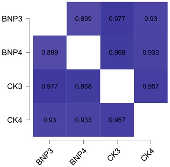 Pearson’s heatmap of CK and NT-pro-BNP at week eight: BNP3: NT-pro-BNP level before 60 mSE at the 8th week, BNP4: NT-pro-BNP level after 60 mSE at the 8th week, CK3: CK level before 60 mSE at the 8th week, CK4: CK level after 60 mSE at the 8th week.