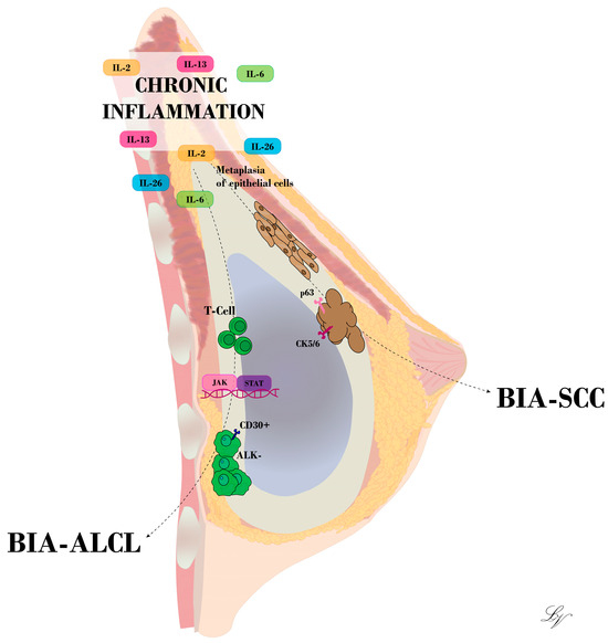 Experimental studies conducted in mouse models have elucidated that the implantation of alloplastic materials serves as a predisposing factor for tumorigenesis, particularly with regard to sarcomas [18]. As concerns breast implants, initial concerns about the risk of breast cancer development have been extensively disproved. Nonetheless, in recent decades, an increasing number of medical reports have shifted attention to the occurrence, although rare, of tumors arising from the breast implant capsule [19]. The implantation of devices such as breast tissue expanders or implants evokes a foreign body reaction characterized by the recruitment of immune system mediators, including macrophages and T-cells, and the formation of a fibrous tissue capsule, which envelops and isolates the implanted foreign body. Overall, this process is a benign physiological immune response led by the activation of an inflammatory cascade [20]. In the early phase, the peri-implant fibrous capsule is primarily made up of granulation tissue, which matures and is gradually replaced by collagen type I. Despite the periprosthetic tissue surrounding the implant, the chronic immune response to the implant persists, and the longer it does so, the higher the chance of DNA modification (Figure 1). Therefore, it could be inferred that the greatest risk factor for BIA-ALCL and BIA-SCC is inflammation, or more specifically, chronic inflammation. Breast cancer and a history of non-breast cancer neoplasia are not considered independent risk factors [21]. In fact, reports of these neoplasia have been found in association with both cosmetic and reconstructive breast implant capsules [22]. For BIA-ALCL, inflammatory stimuli may cause DNA modifications, which in turn triggers the activation and dysregulation of T-cells; for BIA-SCC, this may include the metaplasia of epithelial cells.