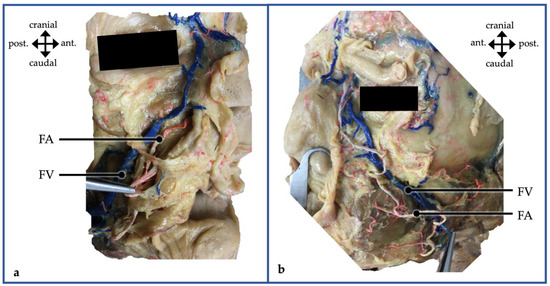 For this study, 90 halved viscerocranium specimens were included. Specimens consisted of 43 male specimens (thereof 21 left and 22 right sides) and 47 female specimens (thereof 20 left and 27 right sides). Age at the time of death of the underlying individuals ranged between 39 and 96 years. While alive, all body donors gave their informed consent for the use of their postmortem tissues for research purposes. All body donors were bequeathed to the Division of Macroscopic and Clinical Anatomy of the Medical University of Graz (Austria) under the approval of the ongoing body donation program of the Medical University of Graz and in accordance with the Styrian Death and Funeral Act. All specimens were embalmed using a modified Thiel technique [51,52]. For enhanced visualization and discrimination purposes, the main trunk of the facial artery and facial vein were injected with colored latex in red and blue color, respectively. For this purpose, the vessels were exposed below the level of the mandible, an incision was made in the vessel, and the latex mass was injected via a cannula. The injection mass consisted of 70% distilled water and 30% nature latex GIVUL MR (Fa. Helmut Bergk, Frankfurt/Main, Germany) and was mixed with red color for arterial injection and blue color for venous injection (Figure 1).
