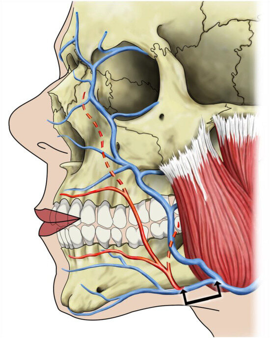 - Meegalla, N.; Sood, G.; Nessel, T.A.; Downs, B.W. Anatomy, Head and Neck, Facial Arteries. In StatPearls; StatPearls Publishing: Treasure Island, FL, USA, 2021. [Google Scholar]