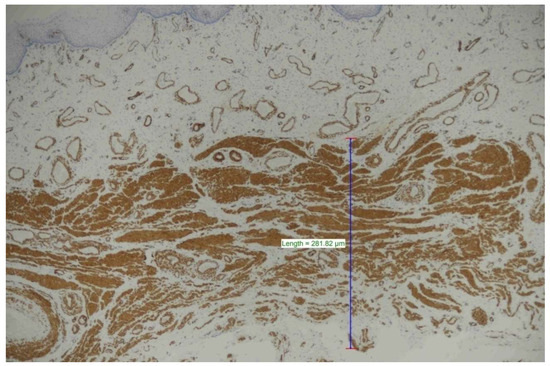 Smooth muscle actin (SMA) (clone monoclonal Mouse anti-human Smooth Muscle Actin clone 1A4) was studied in a DAKO (Omnis, EnVisionTM FLEX, High pH Code GV800) fully automatic immunohistochemistry staining device for the evaluation of muscle thickness in the samples. The stained preparations obtained were measured for each case using a software program (NIS element) by determining the thickest part of the muscle under a Nikon Eclipse Ni light microscope (Figure 1).