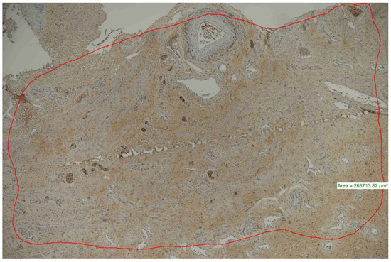 To evaluate the number of peripheral nerves in the samples, a PGP 9.5 (clone Polyclonal Rabbit Anti-PGP 9.5 Code No./Code/Code-Nr. Z 5116) DAKO (Omnis, EnVisionTM FLEX, High pH Code GV800) fully automatic immunohistochemistry staining device was used. The stained preparations were examined under a Nikon Eclipse Ni light microscope, and the number of peripheral nerves per mm2 was determined using a software program (NIS element) (Figure 2).
