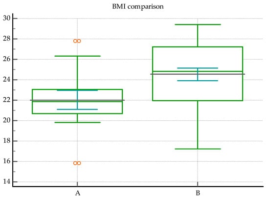BMI comparison between the two groups: A = the co-infection group, B = the SARS-CoV-2 group; p = 0.0002.