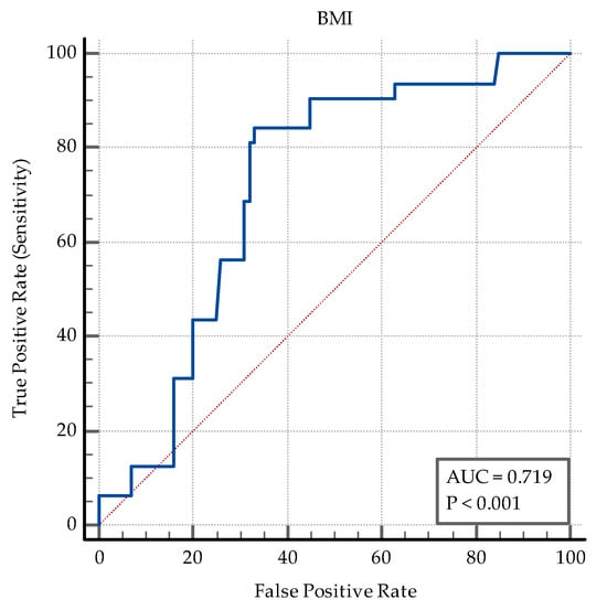 The AUC-ROC analysis showed that sex (Figure A1) and age are not reliable discriminators, p = 0.08, and p = 0.058, respectively. The analysis revealed that a cut-off value for the BMI ≤ 23.23 was significant for discriminating between the presence of PTB co-infection and its absence (p < 0.0001), see Figure 2 and Table 4. Hence, the smaller the value of BMI, the higher the probability of TB co-infection.