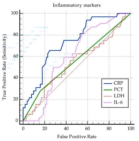 We analyzed the following blood markers: C-reactive protein (CRP, mg/L), procalcitonin (PCT), aspartate aminotransferase (AST, U/L), alanine aminotransferase (ALT, U/L), lactate dehydrogenase (LDH, U/L), inteleukin-6 (IL-6, pg/mL), D-dimer levels (mg/L), neutrophil, lymphocyte and platelet count (/µL) []. We calculated the neutrophil to lymphocyte ratio (NLR) [], the platelet to lymphocyte ratio (PLR) [], and the systemic immuno-inflammatory index (SII), calculated as platelet count x NLR [].