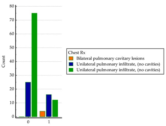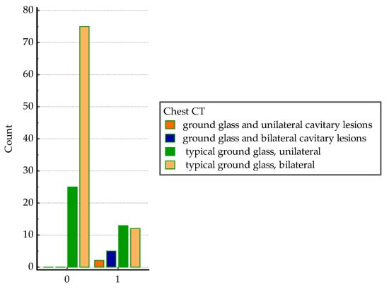 With regard to the presence of ground glass opacities and cavitary lesions on chest CT, the following analysis involved only their presence. Ground glass and bilateral cavitary lesions were considered the most severe finds and were significantly associated with co-infection (Chi-squared = 29.1, DF = 3, p < 0.0001), see Figure 7.