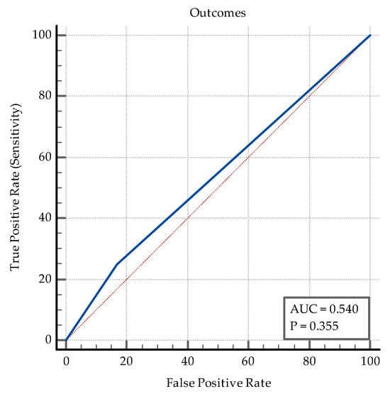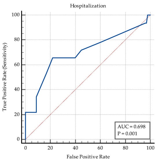 The length of hospitalization is also a reliable parameter that discerns between the two groups, with a cut-off (criterion) of >10 days, AUC = 0.69, p = 0.001, Se% = 65.62, 95% CI = 46.8–81.4, Sp% = 78, 95% CI = 68.6–85.7, PPV% = 48, NPV% = 87.6 (see Figure 8).