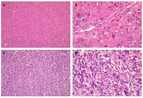 In our first case, moderate cellularity was observed, accompanied by distinctive spindle-like arrangements of tumor cells embedded within a diffuse collagenous matrix. The tumor exhibited elongated cells arranged in long sweeping to poorly formed fascicles (