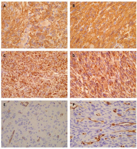 The performed immunohistochemical analysis showed very similar expression patterns in both presented cases. Markers specific for smooth muscle differentiation confirmed the histogenesis of both tumors. Both leiomyomas revealed positive staining for smooth muscle actin (SMA), confirming their smooth muscle origin (