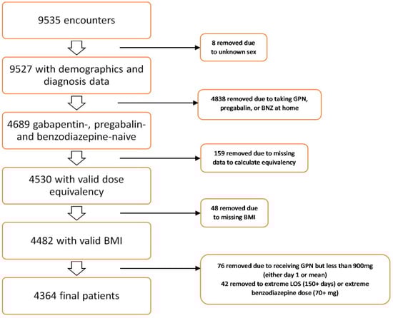 A total of 9535 patients with AW were identified between 1 January 2020 and 31 August 2022. Of these, 8 patients were excluded due to a lack of demographic information, and 4838 patients were excluded due to prior use of gabapentin, pregabalin, or benzodiazepines, leaving 4689 benzodiazepine- and gabapentin-naive patients as the initial sample. Subsequently, 207 patients were excluded due to missing data needed to calculate equivalency, and 76 patients were excluded due to low-dose gabapentin use (<900 mg/day). An additional 42 patients were excluded due to extreme length of stay (>150 days) or extreme doses of benzodiazepine (>70 mg of lorazepam equivalent dose over the entire hospital stay). Figure 1 illustrates the flowchart of patient exclusions.