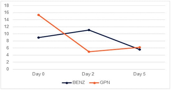 CIWA score change between day 0, day 2, and day 5 for benzodiazepine-only group (N = 333) compared to gabapentin plus benzodiazepine group (N = 7). BENZ: benzodiazepines group. GPN: gabapentin plus benzodiazepines group.