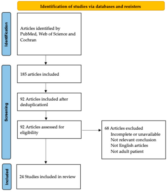 We included all studies evaluating the effectiveness of bridge therapy in the case of advanced HCC. Articles were searched in PubMed, Web of Science, and Cochrane. The search keywords were as follows: “transarterial chemoembolization” or “chemoembolization” or “TACE” AND “advanced hepatocellular carcinoma” or “advanced HCC” or “advanced liver cancer” or “advanced liver tumor” AND “sorafenib”. We selected 185 articles. After deduplication, we considered 92 articles. The references were screened. The selected articles had to match the following inclusion criteria. First of all, they had to be not only linked to the topic, but also show significant results in terms of survival and de-listing. Articles had to be written in English. Moreover, we only considered studies involving adult patients (age ≥ 18). We included 24 articles and excluded 68 (Figure 1).