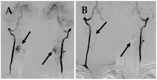 - Kim, M.; Subah, G.; Cooper, J.; Fortunato, M.; Nolan, B.; Bowers, C.; Prabhakaran, K.; Nuoman, R.; Amuluru, K.; Soldozy, S.; et al. Neuroendovascular Surgery Applications in Craniocervical Trauma. Biomedicines 2023, 11, 2409. [Google Scholar] [CrossRef]
