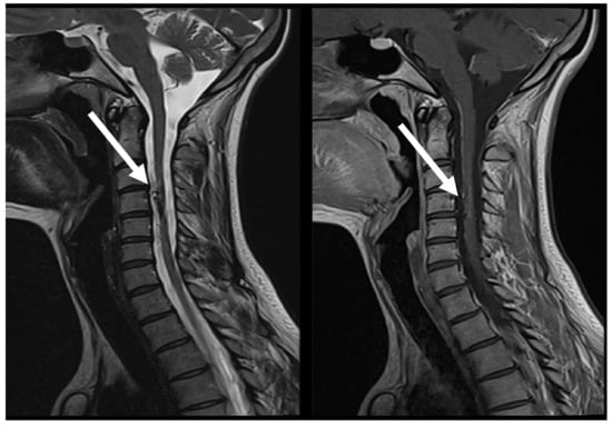 - Alobeidi, F.; Thurnher, M.M.; Jäger, H.R. Non-Tumoural Spinal Cord Lesions. In Grainger & Allison’s Diagnostic Radiology; Elsevier: Amsterdam, The Netherlands, 2021. [Google Scholar]