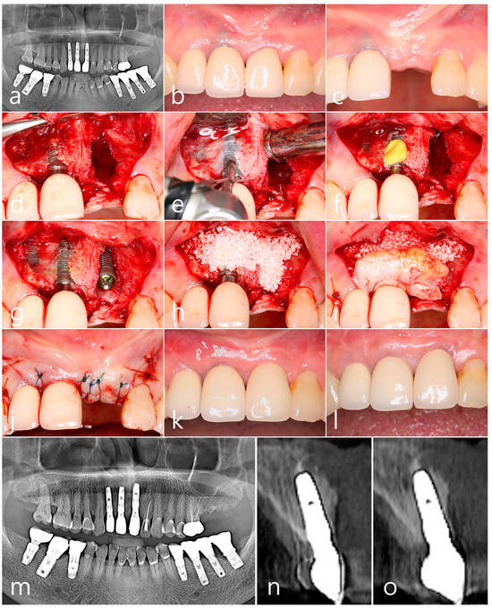 A 70-year-old female non-smoker patient had implants #11, #12, and #21 placed using a flapless technique three years prior. Panoramic radiography showed that while the interproximal bone level of implant #11 was well maintained, there was a noticeable space widening with loss of osseointegration in implant #21 (Figure 1a). In the clinical findings, 3 years after prosthesis delivery, a gray titanium color was seen according to the resorption of the #11 implant’s facial bone. This is PSTD Class I, according to Zucchelli et al. [3]. Implant #21 developed mobility due to a loss of osseointegration (Figure 1b). Implant #21 was removed, and implant placement was planned 2 months later. The extraction socket of implant #21 healed well (Figure 1c). Under local anesthesia, vertical incisions were made at the distobuccal line angle of the #11 implant and the mesiobuccal line angle of the #21 tooth. After the midcrestal incision, the labial mucoperiosteal flap was reflected. Resorption of the facial bone and exposure of the implant surface of implant #11 were observed (Figure 1d). A rotary titanium brush (Dentium, Suwon, Republic of Korea) was used to decontaminate the exposed areas of implants #11 and #12 (Figure 1e). Additional chemical detoxification was performed with tetracycline (Tc) HCl (Chong Kun Dang Pharmaceutical., Seoul, Republic of Korea) for 5 min. The granulation tissue in the extraction socket of the #21 implant was thoroughly debrided (Figure 1f). After sufficient saline irrigation, a new implant was placed 3.0 mm subcrestally from the adjacent proximal bone at site #21 (Figure 1g). Lateral bone augmentation was performed using a synthetic bone graft substitute (Osteon III, Genoss, Suwon, Republic of Korea) (Figure 1h). An SCTG was acquired by a trap-door approach in the left palate and fixed with a 4-0 catgut through a sling suture in the #11 implant. The SCTG was placed in a more coronal position (Figure 1i). The overlying mucoperiosteal flap was closed with 4-0 nylon (Figure 1j). No events were found in the postoperative healing process. Uncovering was performed 6 months after surgery, and the final prosthesis was delivered 2 months later. In implant #11, the esthetics were restored (Figure 1k). In the clinical findings 4 years after surgery, the esthetics of the #11 implant were well maintained, and 1 mm gingival recession was observed in the #21 implant (Figure 1l). In panoramic radiography taken 4 years after prosthesis delivery, there was no change in the crestal bone level around the implant (Figure 1m). Labially augmented bone was observed on the buccal side of the implant in cross-sectional images of CBCT taken after the prosthesis was delivered (Figure 1n). Less than 2 mm of labial bone resorption was observed in cross-sectional images of CBCT taken 4 years after the prosthesis was delivered (Figure 1o).