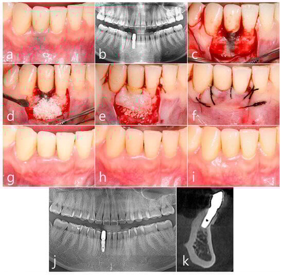 A 25-year-old female non-smoker patient developed peri-implant dehiscence in the buccal gingiva 3 years after implant #31 was placed. The placed implant was a Ø 3.3 × 10 mm Zimmer TSV implant (Zimmer Biomet, Warsaw, IN, USA) (Figure 3a). No crestal bone loss was found in the panoramic radiography (Figure 3b). This is PSTD Class II, according to Zucchelli et al. [3]. Under local anesthesia, a vertical incision was made in the distal line angle of the adjacent teeth of the #31 implant, and a crevicular incision was made to include the buccal interdental papilla. The buccal mucoperiosteal flap was reflected. The implant surface was exposed on the buccal surface of implant #31. Surface decontamination was performed using a rotary titanium brush (Dentium, Suwon, Republic of Korea) (Figure 3c). Additionally, chemical detoxification was performed with Tc HCl. Sufficient cleaning was achieved by saline irrigation (Figure 3d). A bone graft was performed using a synthetic bone graft substitute (Osteon III, Genoss, Suwon, Republic of Korea) (Figure 3e). An SCTG obtained from the left palatine surface was fixed to the bone graft with 4-0 catgut (Figure 3f). The overlying mucoperiosteal flap was also closed with a 4-0 catgut (Figure 3g). In the clinical picture, 1 month after the procedure, the dehiscence of the peri-implant mucosa disappeared, and the esthetics were restored (Figure 3h). In the clinical findings, 4 years after the procedure, the thickness of the peri-implant mucosa increased (Figure 3i). No changes in the crestal bone were observed in panoramic radiography taken 4 years after the procedure (Figure 3j). Augmented bone was observed on the labial surface of implant #31 in a cross-sectional image of CBCT taken 4 years after the procedure (Figure 3k).