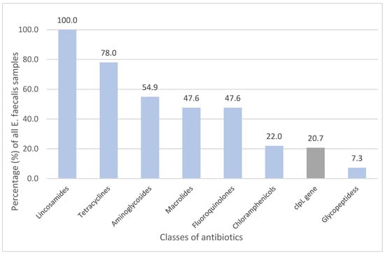 Isolates of E. faecalis carried resistance genes and mutations against seven different classes of antimicrobial agents: lincosamides (100%), tetracyclines (78.0%), aminoglycosides (54.9%), macrolides (47.6%), fluoroquinolones (47.6%), amphenicols (22.0%) and glycopeptides (7.3%) (Figure 1).