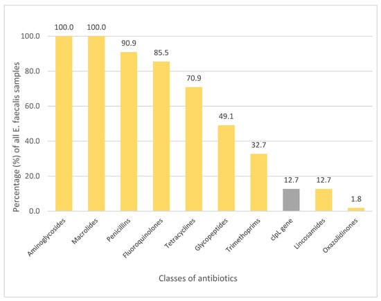 Observed gene resistance against classes of antibiotics in isolates of E. faecalis (%).