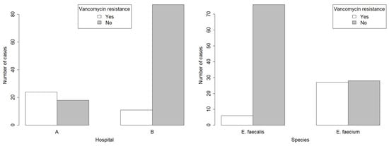 In total, 35 of 140 (25.0%) analysed samples were genetically vancomycin-resistant. Specimens of Enterococci collected at hospital “A” showed vancomycin resistance in 57.1% (n = 24/42) of the cases, whilst in strains isolated from hospital “B” VRE was detected in 11.2% (n = 11/98) of all specimens, which is 5.1 times less in comparison to hospital “A” (p-value < 0.001) (plot is on the left of Figure 3). The incidence of VRE between two of the most commonly isolated strains showed significant result differences; 7.3% (6/82) of E. faecalis in comparison to 49.1% (27/55) of E. faecium samples were vancomycin-resistant (p-value < 0.001) (plot is on the right of Figure 3).
