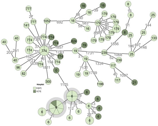 In order to evaluate the genetic relatedness of E. faecalis isolates specifically, it is recommended to examine strains with 0–7 allelic differences to call them related []. Figure 4 shows that high genetic similarity between four and more isolates can be observed in two clusters (marked in grey), which could indicate a potential outbreak. In one case there are seven related samples and in the other case—four. All of the isolates in these clusters are ST6 and multiresistant; however, vancomycin resistance was not observed in this cluster. This Enterococcus outbreak is mainly local to hospital “B” in the year 2022, except for one isolate which was obtained from hospital ”A” in 2021. This might indicate a transmission of pathogenic bacteria between the hospitals.
