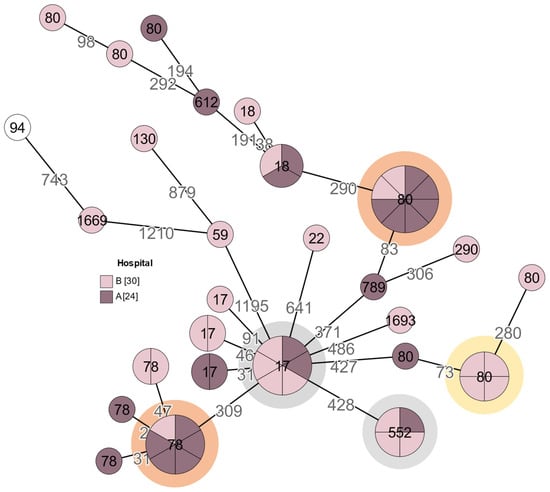 A minimum spanning tree of E. faecium isolates (n = 55). Isolates with up to 20 allelic differences are collapsed into larger nodes. The count of allelic differences between the most similar genotypes is indicated with numbers on the connecting branches. For better visibility, branch lengths are shown in a logarithmic scale. The number on each node represents its sequence type. The coloured circles indicate possible outbreaks: Grey—related vancomycin susceptible isolates; Yellow—related vanA type isolates in hospital “B”; Orange—related vanB type isolates. The number of isolates obtained from each hospital is shown in square brackets.