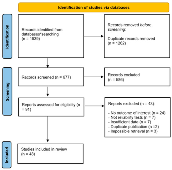 All search records were initially compiled using EndNote (version 20, Clarivate Analytics, Philadelphia, PA, USA) and JBI SUMARI. A total of 1939 studies were identified based on the predefined search criteria. After an initial screening phase, 1262 datasets were excluded due to non-compliance with the inclusion criteria. Subsequently, 677 records underwent a dual screening process conducted by two independent reviewers (JL and RP). Out of these, 586 records were further excluded, leaving 91 records for more comprehensive examination. Ultimately, 43 studies were excluded for various reasons, including lack of outcomes of interest (n = 24), absence of reliability tests (n = 7), insufficient data (n = 7), duplicate publication (n = 2), and inability to retrieve the publication (n = 3). This resulted in the inclusion of 48 studies in the systematic review, achieving complete inter-reviewer agreement (k = 1.0). The detailed study selection process is illustrated in Figure 1.