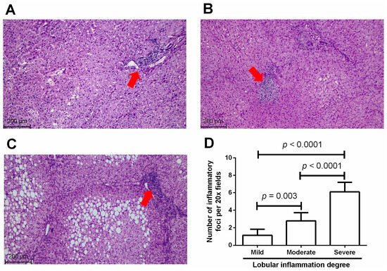 Histologic examination and grading of liver specimens. We stained 4 μm thick slices of liver tissue with hematoxylin–eosin, examining the areas between the hepatic lobules to score lobular inflammation according to the Brunt scoring system as follows: (A) mild lobular inflammation, <2 inflammatory foci/20× fields; (B) moderate lobular inflammation, 2–4 inflammatory foci/20× fields; (C) severe lobular inflammation, >4 inflammatory foci/20× fields. Red arrows indicate the presence of inflammatory foci. Scale bars show the 200 μm magnification at which we acquired the microphotographs. (D) After quantifying the number of inflammatory foci, we compared data by one-way ANOVA followed by Tukey’s multiple comparison test, considering a p < 0.05 significant.
