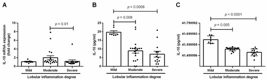 The qPCR analyses revealed that patients with severe lobular inflammation displayed a significant decrease in the hepatic mRNA expression of IL-10 compared with individuals showing moderate lobular inflammation (p = 0.01) (Figure 2A). In the same sense, subjects exhibiting moderate lobular inflammation showed an apparent 2-fold decrease in IL-10 protein levels compared with that found in individuals with mild lobular inflammation (p = 0.008) (Figure 2B). Notably, patients belonging to the severe lobular inflammation group exhibited an evident 2.8-fold reduction in IL-10 protein values compared with subjects within the mild lobular inflammation group (p = 0.0008) (Figure 2B). It is worth mentioning that the circulating levels of IL-10 displayed the same behavior as IL-10 mRNA and protein values in hepatic tissue. Specifically, individuals in the moderate lobular inflammation group showed a significant 11 percent reduction in the serum IL-10 levels compared with subjects with mild lobular inflammation (p = 0.005) (Figure 2C). However, patients with severe lobular inflammation exhibited an evident 20 percent diminution in the circulating values of IL-10 compared with subjects showing mild lobular inflammation (p < 0.0001) (Figure 2C). Differences in both mRNA and protein levels of IL-10 among mild, moderate, or severe lobular inflammation subjects remained unaltered after adjusting for confounding variables, including age, sex, the timing of obesity, T2D, and SAH.