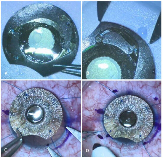The process for assembling an AI implant-toric–IOL complex is as follows: A trephine was used to cut the customized AI implant (Customflex®, HumanOptics, Erlangen, Germany) according to the patient’s eye white-to-white measurements followed by iridectomy (Supplemental Video S1). A small amount of the cohesive ophthalmic viscosurgical device (OVD, Biolon®, Bio-Technology General Ltd., Be’er Tuvia, Israel) was placed on the back surface of the AI implant to facilitate the stable placement of a one-piece toric–IOL prior to suturing: First, the IOL, Acrysof®, IQ Toric SN6AT9 +18.00 Diopter, (Alcon, Vernier, Switzerland) was fixated to the AI implant using 10-0 polypropylene sutures (PROLENE®, Ethicon LLC, San Lorenzo, PR, USA) that ran within the iris implant material at the optic–haptic junction, keeping it discrete from the front surface of the AI, and around the IOL haptics on both sides. The IOL was set on the AI implant so that the iridectomy could be positioned superiorly. Second, each suture was threaded beneath its haptic to form another knot, tying the suture to the haptic itself, thereby preventing slippage. In the same manner, another suture was added to each distal end of the haptics so that the haptics’ edge was restricted from chafing the ciliary body (Figure 1A).