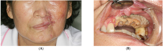 A 73-year-old woman fell and lost a few of her left maxillary teeth. A month or two later, she acquired herpes zoster (shingles) with severe pain on the left side of her face and mild limitations in mouth opening, and was admitted to the hospital for a few days to relieve symptoms. This medical history was obtained from the medical records of another hospital where she had been treated for herpes zoster. Six months later, she was referred to the author’s department with the chief complaint of missing teeth and left gingival pain. Her account indicated that she lost a few teeth without facial bone fracture as a consequence of a fall and subsequently lost more teeth following the treatment of herpes zoster. She had a scarred skin lesion on the left infraorbital area (Figure 1A), with exposed alveolar bone observed at the left maxilla (Figure 1B). Teeth #21, 22, 23, 24, 25, and 28 were exfoliated, and the exposed bone was necrotized with remaining teeth #26 and 27. She had no other systemic disease, except for mild hypertension without symptoms. No history of medication or radiotherapy known to cause osteonecrosis of the jaw was found.