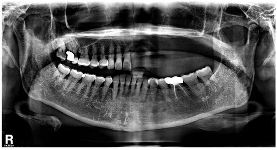 - Faure, E.; Engels-Deutsch, M.; Paraschiv, E.-A.; Gérard, E.; Curien, R. Mandibular osteonecrosis following herpes zoster infection: Report of a rare case with a literature review. Clin. Case Rep. 2021, 9, e04196. [Google Scholar] [CrossRef]