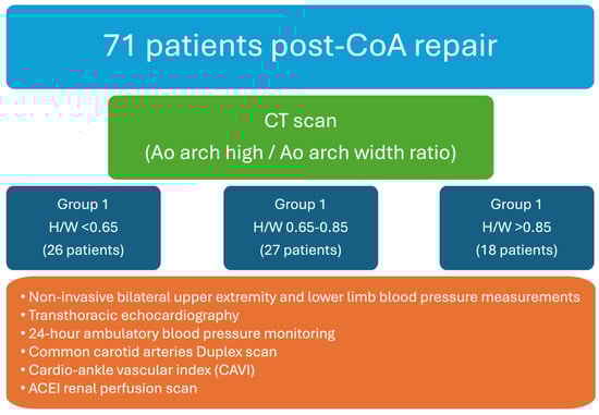 In this prospective cohort study, adult individuals with post-repair (surgical or percutaneous) coarctation of the aorta were enrolled. The exclusion criteria encompassed individuals with complex congenital heart diseases; hemodynamically significant aortic valve stenosis; chronic renal insufficiency, characterized by an estimated glomerular filtration rate (eGFR) of <45 mL/min; patients diagnosed with stage III-IV malignancies or psychiatric disorders; and those who were pregnant or intending to conceive during the study period. Participants enrolled in the study underwent an initial clinical evaluation followed by an extensive assessment regimen. This regimen included continuous 24 h ambulatory blood pressure monitoring, common carotid artery duplex scans, calculation of the cardio–ankle vascular index (CAVI), delineation of the aortic anatomy through computed tomography (CT) imaging, and evaluation of the renal function via renal perfusion scanning (Figure 1).