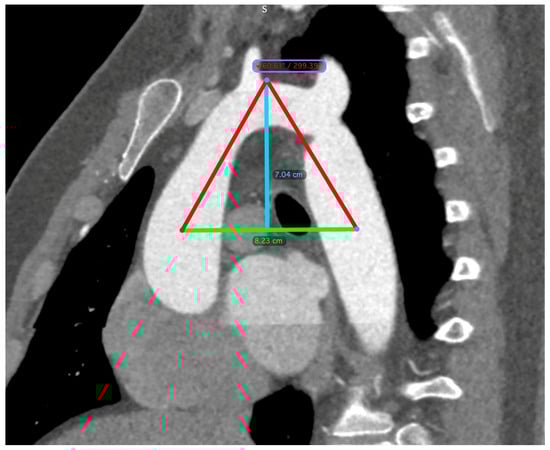 The diagnosis of CoA was established via computed tomography (CT) imaging. Aortic dimensions were meticulously determined through three-dimensional reconstructions, employing oblique angles orthogonal to the vessel’s longitudinal axis. The aortic perimeter was calculated using the formula: perimeter divided by π (where π is approximately 3.14). Measurements were taken at critical anatomical points, including the midpoints of the ascending aorta and descending aorta, both aligned with the right pulmonary artery, the midpoint of the aortic arch (either situated between the common carotid artery and the left subclavian artery or located at the apex of the aortic arch), the isthmus, and the aorta at the diaphragmatic level. A triangle was constructed, linking the arch apex with the midpoints of the ascending and descending aorta, from which the arch angle (vertex angle of the triangle) and arch height and width (base of the triangle) were derived. The arch height was ascertained by the perpendicular distance from the base to the highest midpoint of the arch (Figure 2).